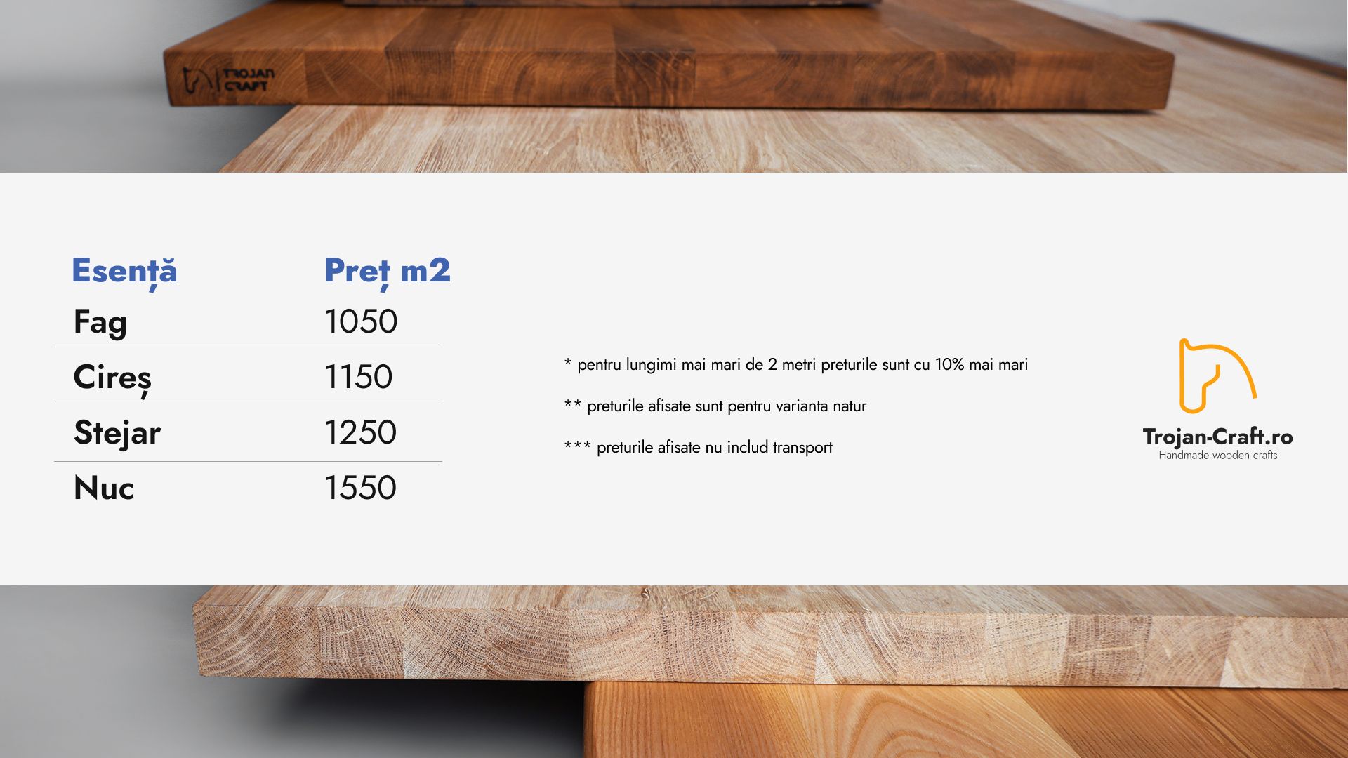 Blatul lemnului va rămâne cu o nuanța crudă a lemnului (care diferă în funcție de esența aleasă).
